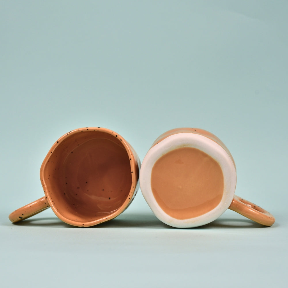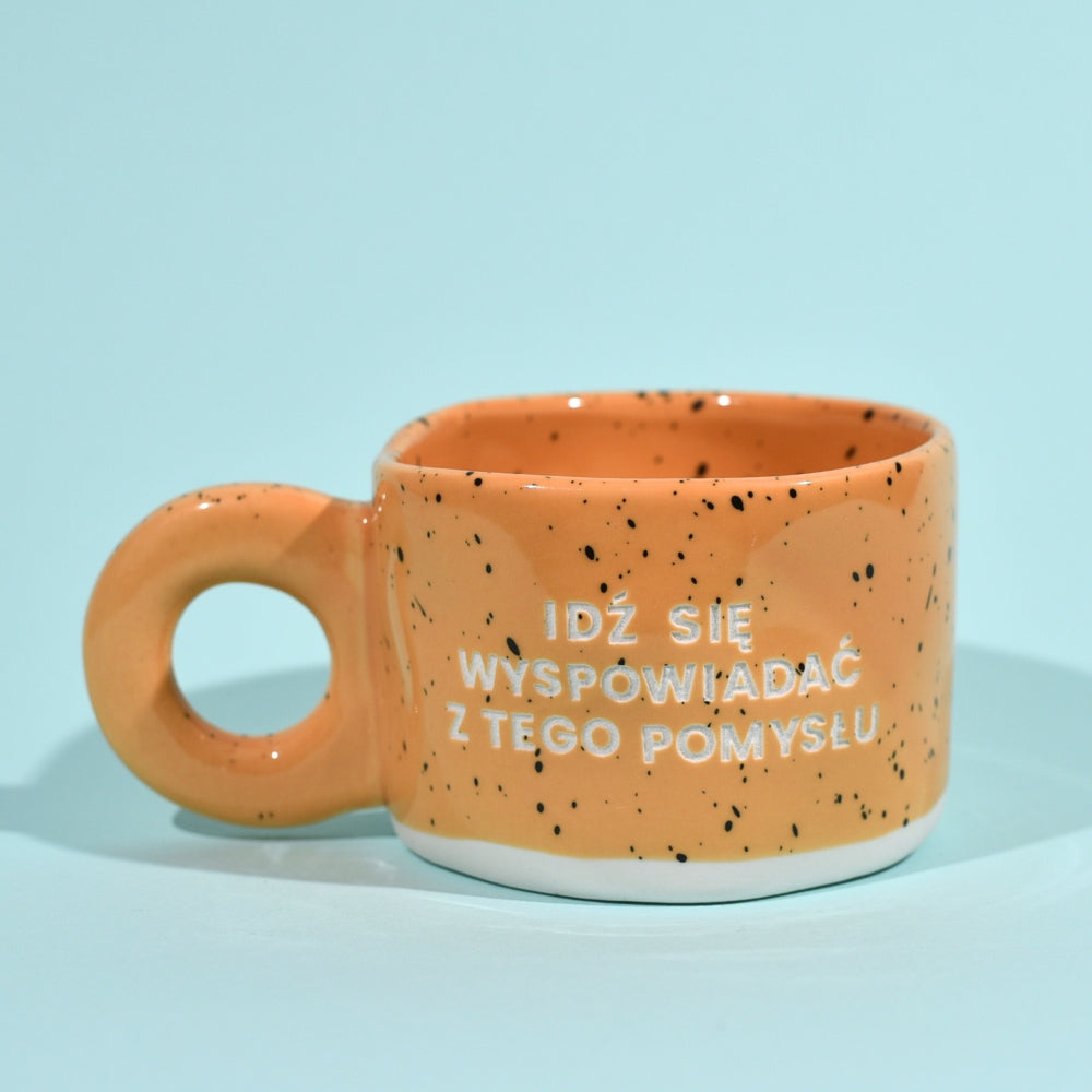 Ręcznie wykonany z ceramiki w rudym odcieniu z czarnym nakrapianiem w stylu retro. Biała podstawa i nieregularna forma nadają mu surowy, rękodzielniczy charakter.